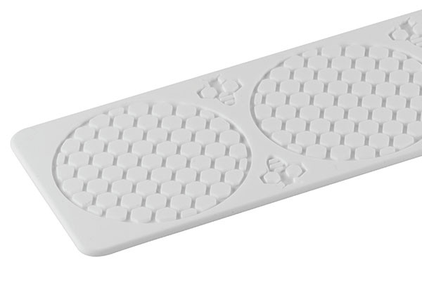 Alvéolé è un sottile decoro che rappresenta la trama a celle esagonali tipica dell'alveare costruito dalle api, dove producono il prezioso nettare. Nello stesso tappetino in silicone, oltre alla texture ad alveare, è prevista una decorazione a forma di ape, per creazioni più realistiche. Alvéolé3 è composto da 5 decorazioni circolari ø 75mm con texture ad alveare e un volume di 3ml ciascuna. Il tappetino in silicone include decorazioni a forma di ape.