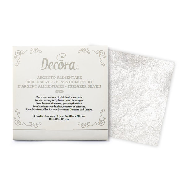L’argento alimentare Decora permette di dilettarsi in decorazioni dal gusto sopraffino e dal aspetto prezioso. Confezione da 5 fogli di dimensioni 86×86 mm.
