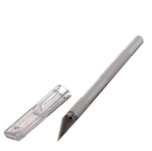 Bisturi per decorare in acciaio. Il bisturi è dotato di 2 lame interscambiabili. Completo di cappuccio di sicurezza in plastica.