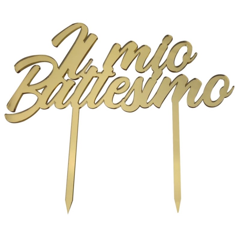 Scintillante cake topper in Plexiglass Specchiato Oro, ideale per apporre sulla torta in occasione del Battesimo. La scritta รจ provvista di due prolungamenti che ne assicurano un fissaggio agevole. Il plexiglass รจ ricoperto da una pellicola in modo da mantenere la lucentezza e evitare che si danneggi.