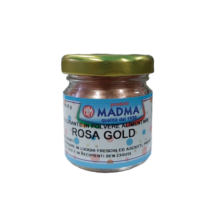Il Colorante Alimentare Rosa Gold della Madma รจ in polvere e idrosolubile. Per uso alimentare, idrosolubile in barattolino da 8 g di colore in polvere idrosolubile uso alimentare ad alta concentrazione per pasta di zucchero e preparati.