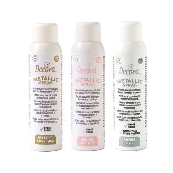 I Coloranti Spray della Decora sono spray alimentare colorato da utilizzare per colorare e decorare pasta di zucchero, pasta di gomma e cioccolato.