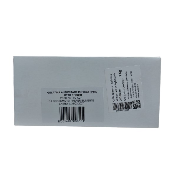 Detta anche "colla di pesce", la gelatina alimentare in fogli è un addensante molto usato nella preparazione di dolci: in particolare mousse, panna cotta e crema bavarese. Ideale per uso alimentare ed enologico. Qualità: foglia oro. Confezione da 1 kg.