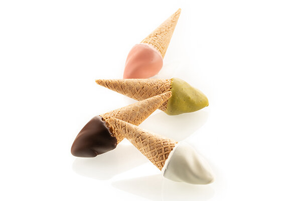 Linea: Conoflex Il nuovo stampo di Silikomart per realizzare perfetti coni gelato in modo facile e veloce. linea: Conoflex Set 3 pz con vassoio 30 x 40 cm Dimensioni: Ø 30 h 35 mm Volume: 26 x 12,5 = 325 ml