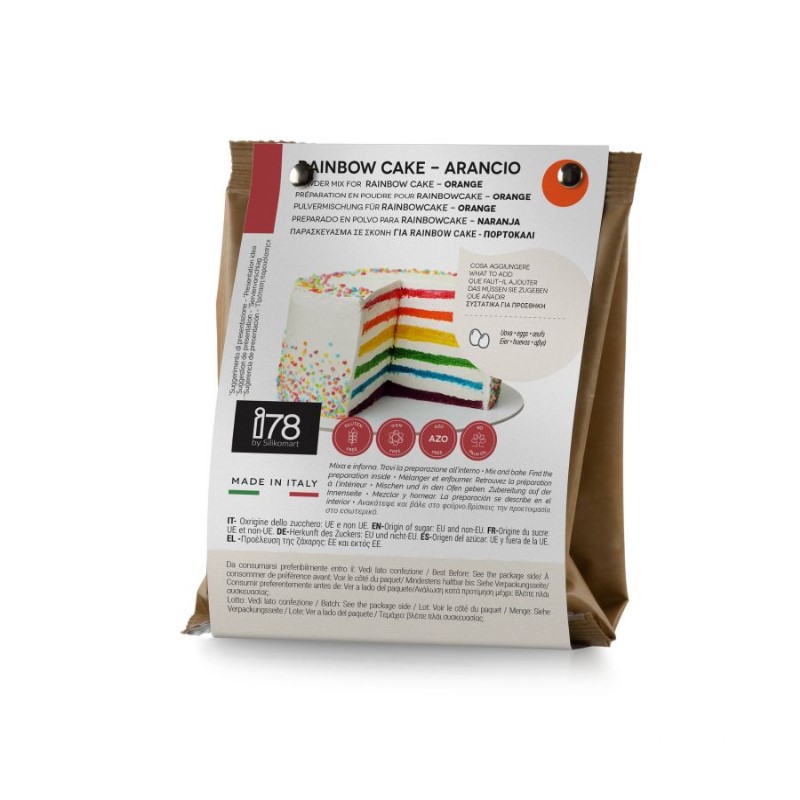 La Rainbow Cake, o Torta Arcobaleno, con tuti i colori dell'arcobaleno rappresenta la bandiera della pace. La confezione contiene la dose per uno strato della torta dal colore arancione e al gusto di pesca. Il colore al composto รจ dato dall'utilizzo di coloranti di estrazione naturale rendendolo adatto anche ai piรน piccoli. La dose permette di realizzare un fondo da ร 22-24cm