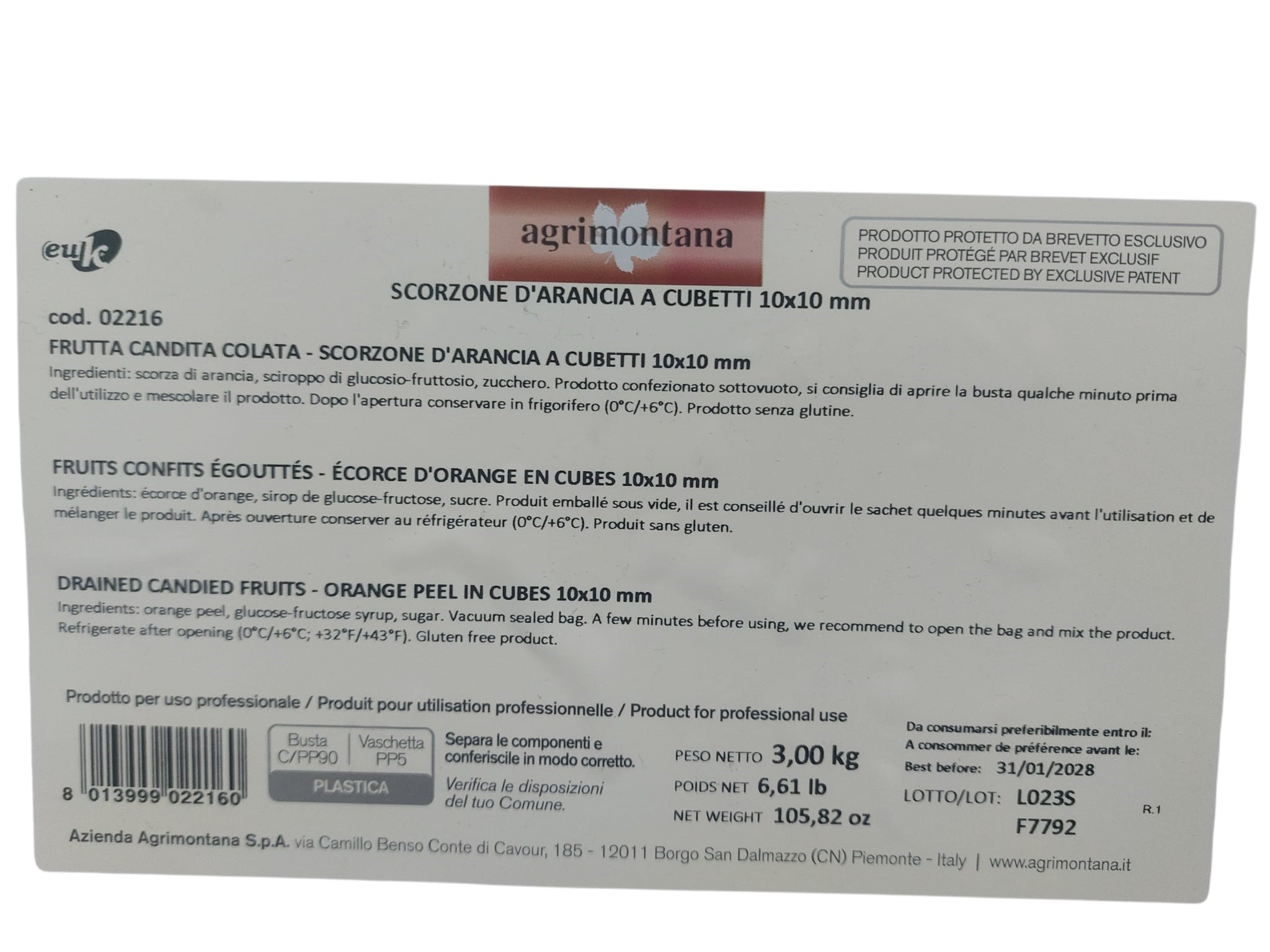 Prodotto e confezionato da Azienda Agrimontana S.p.a. in Via Camillo Benso Conte di Cavour 185 12011 Borgo san Dalmazzo (CN)