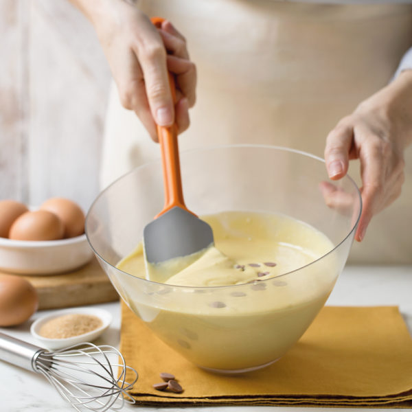 Utensile da cucina in 100% Silicone Platinum*, con manico ergonomico in plastica. Indispensabile per amalgamare ogni tipo di preparazione, dolce o salata. E' dotato diย un angolo squadrato e uno arrotondato, per raccogliere con praticitร ogni residuo di impasto.