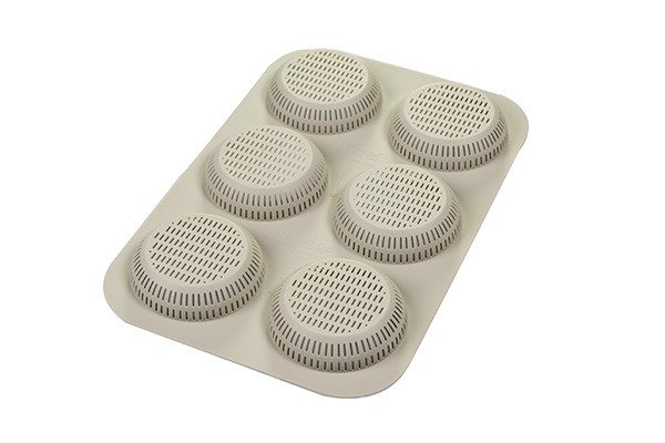 Dimensioni: 200mm x 340mm x h20mm, con 6 cavità da Ø80mm