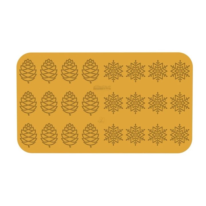 Inverno presenta due diversi disegni sullo stampo, pigna e fiocco di neve. Può essere utilizzato sia con la pâte à cigarette sia con il cioccolato per creare decorazioni eleganti e raffinate.