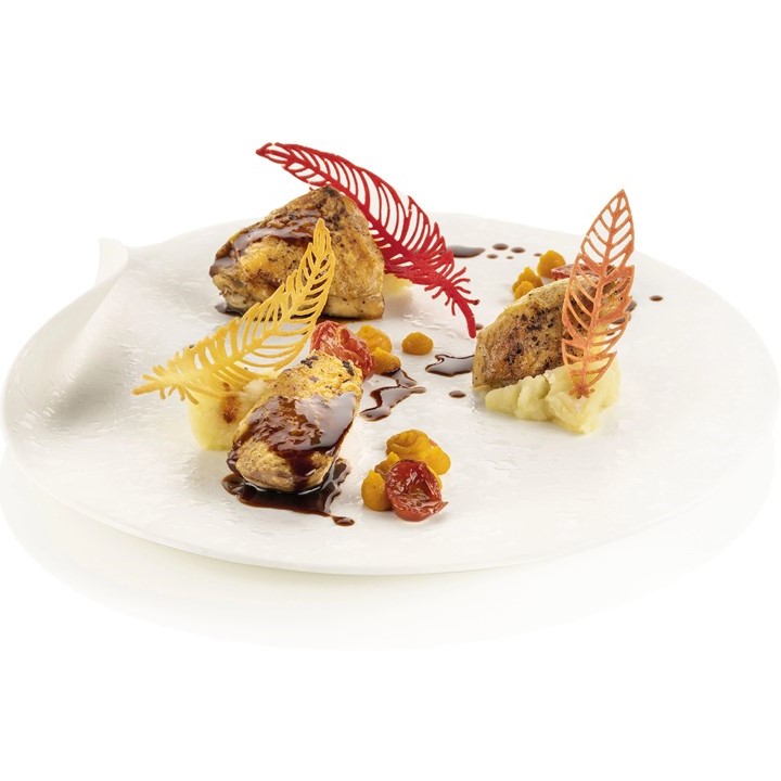 Piuma presenta due forme diverse in un unico stampo. Il tappetino può essere utilizzato sia con la “pâte à cigarette” che con il cioccolato per creare decorazioni eleganti e raffinate. Le decorazioni possono essere preparate in anticipo e sformate all’occorrenza. Sono utili per decorare primi e secondi piatti, per creare originali aperitivi o per dare un tocco raffinato ai dessert al piatto.