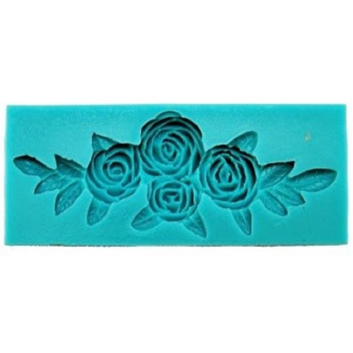 Stampo in silicone alimentare per realizzare una elegante composizione floreale di rose con la pasta di zucchero. La composizione è formata da 4 rose disposte in maniera simmetrica e dalle foglie. Ideale per decorare in maniera elegante i bordi della wedding cake.